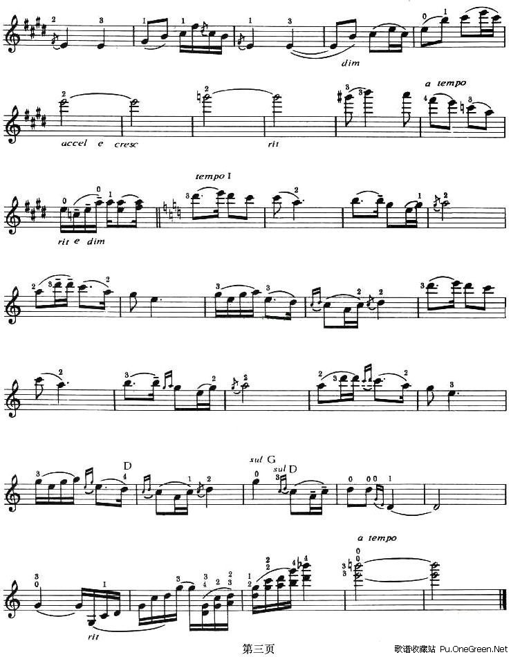 小提琴《思乡曲》中的三次变奏,一方面不断赋于主题新的形象,另一方面又情感递次高涨的作用。第一、二变奏,分别从调式、节奏和音域等方面揭示了主题所含的因素。第三变奏是乐曲的高潮,除了将原商调式的主题改变为宫调式以外,在内部结构、旋律密度、调性、速度等方面都进行了较大的变化,使音乐具有活泼明朗的气息。主题的再使用了音区的调动,明亮的高音区,既表现出小提琴的丰富音色,又使情感的表达更加细腻。最后,乐曲以简短的结尾结束。使人回味无穷的是,乐曲最后落在羽调式的属和弦上造成期待感,使思念之情久久回荡着······